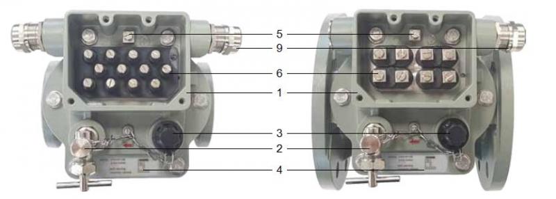 頂蓋是由耐氣候變化的鑄鋁合金制成,表層已涂色. 頂蓋部件上部有一個接線盒(圖4中1),在接線盒前面有一個放氣閥(圖4中2)和一個用悶蓋螺母(圖4中3)覆蓋的測試按鈕,同時上面還附有一個測試按鈕操作說明標牌(圖4中4). 接線盒中除了有一個接地點(圖4中5)外,頂蓋底板內(nèi)還裝有電力引線端子(圖4中6). 通過電力引線端子的數(shù)量可以決定涉及干簧管類型與數(shù)量的開關系統(tǒng)的布線配置.